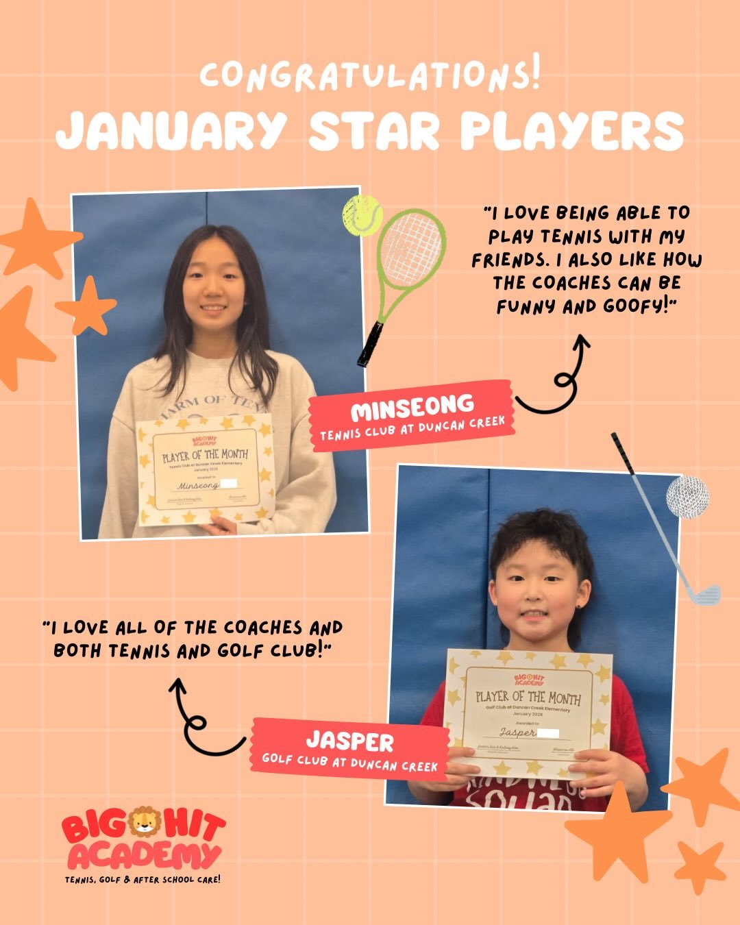At dismissal time around 3:15 PM, the front office will announce over the intercoms for all Big Hit Academy students to start transitioning to the Gymnasium. Your student’s teacher will then help dismiss all Big Hit Academy clubs to their registered club. Teachers have a list of all registered students and are responsible for dismissing our club students to the front of the school where students will meet our club coaches.